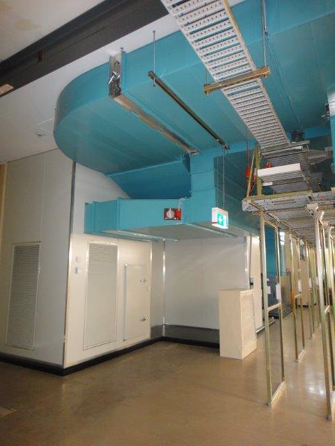 The duct install consisted of two large cold aisle duct runs and one common return air duct all at high level hard up to the underside of the ceiling with sheetmetal droppers to the grilles located in the superstructure below. The ductwork was temporarily connected to the existing base building systems to provide air conditioning for the initial NBN fitout