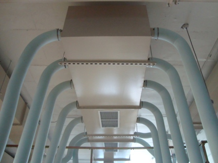 Within the main plant room existing supply and return ducts were relocated and modified to allow the installation of new air conditioning duct work to feed the Level 2 data area above. This duct was installed through the floor into the Level 2 exchange area and above the existing telecommunications super structure. The new supply and exhaust ducts were coordinated around existing ducts and cable trays as well as the available space. New outlets were installed within openings in the superstructure in the aisles between the equipment racks. Supply air grilles were installed in one aisle, then a row of return air grilles and another row of supply air grilles to suit the “hot aisle /cold aisle” rack design principle. All the new equipment within the new racks will be installed so that the hot air is blown from the back of two opposite equipment rows into one common aisle for extraction. The cold air is then supplied to the opposite side of the equipment racks so that it can be drawn through the equipment to provide more efficient cooling as there is little mixing of the cold and warm air as in a conventional open plan air conditioning system.